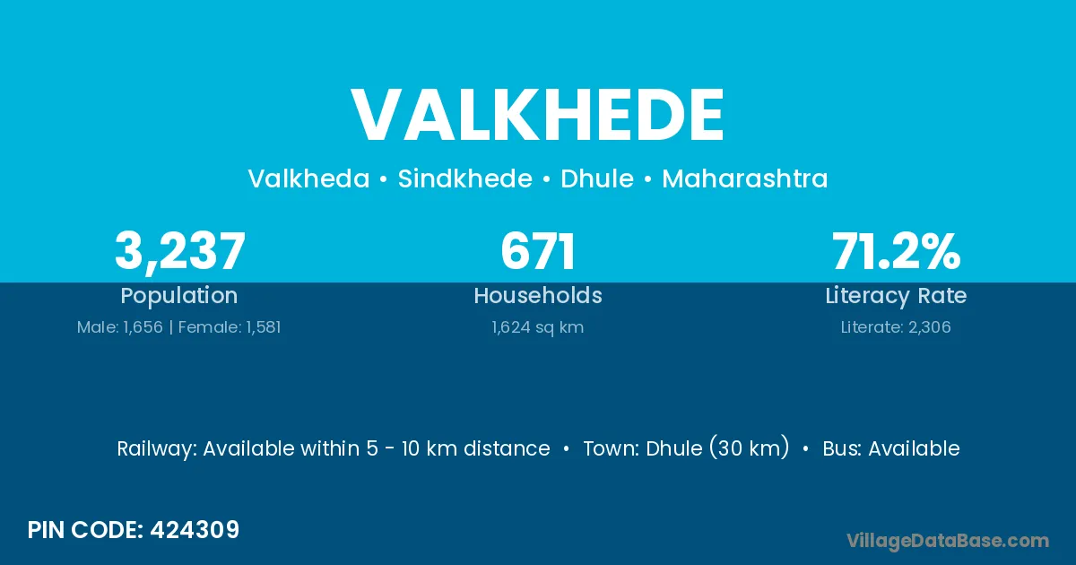 Dhule (30 km) is the nearest town to Valkhede village for major economic activities and is located approximately 30 km away.