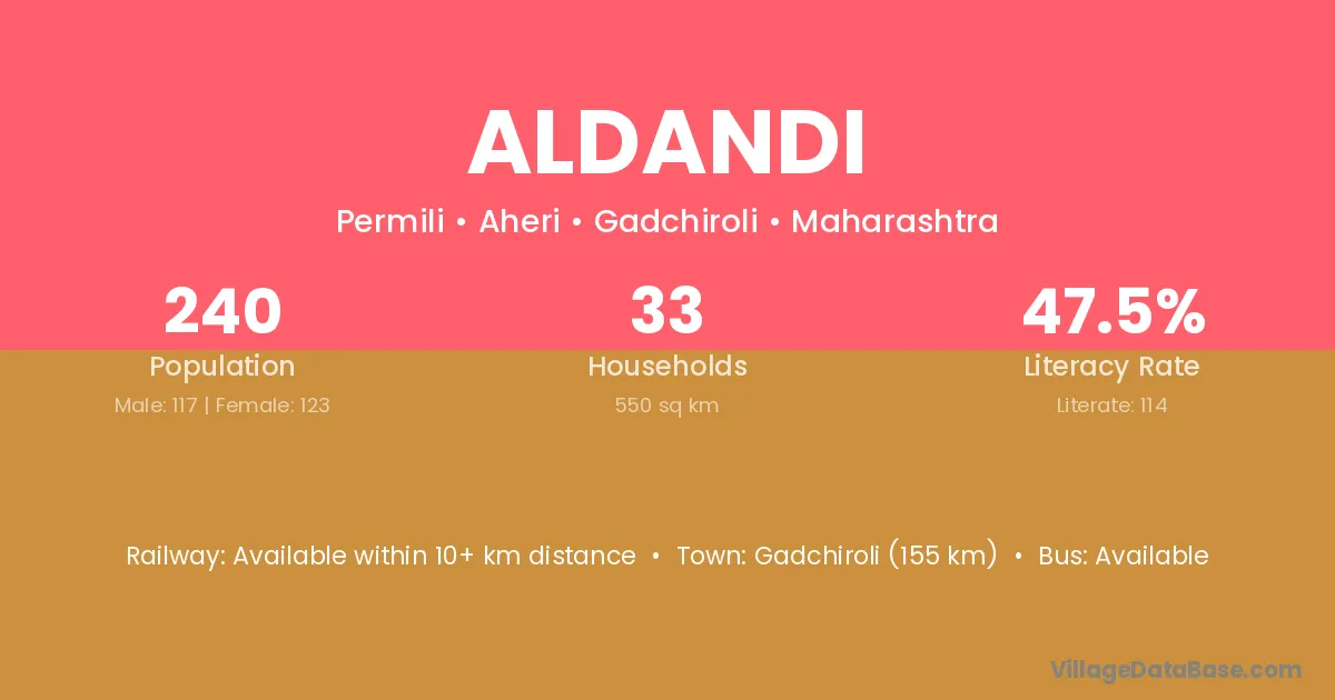 Gadchiroli (155 km) is the nearest town to Aldandi village for major economic activities and is located approximately 155 km away.