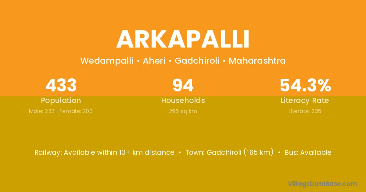 Gadchiroli (165 km) is the nearest town to Arkapalli village for major economic activities and is located approximately 165 km away.
