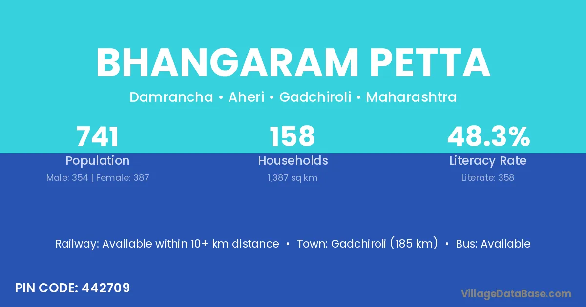 Gadchiroli (185 km) is the nearest town to Bhangaram Petta village for major economic activities and is located approximately 185 km away.