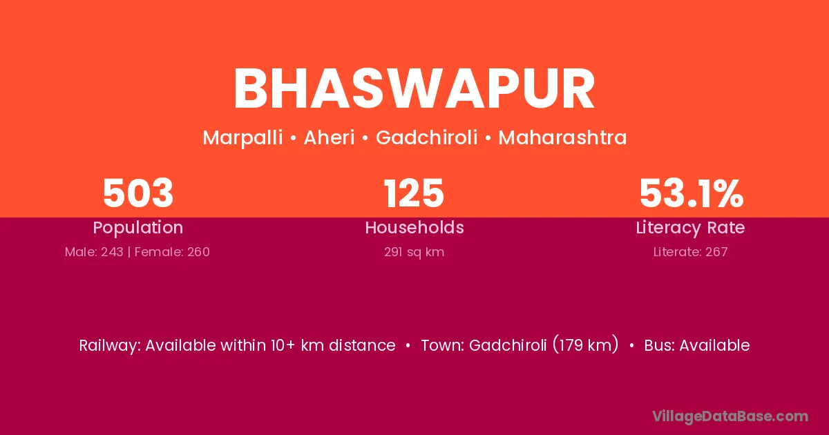 Gadchiroli (179 km) is the nearest town to Bhaswapur village for major economic activities and is located approximately 179 km away.