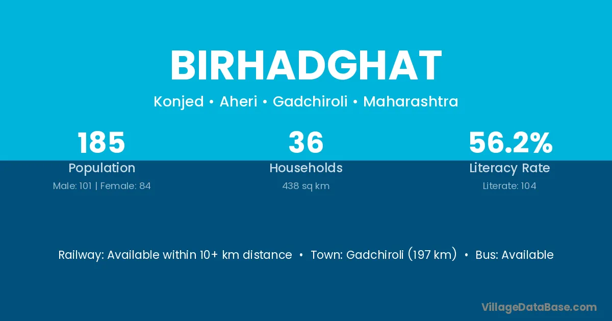 Gadchiroli (197 km) is the nearest town to Birhadghat village for major economic activities and is located approximately 197 km away.