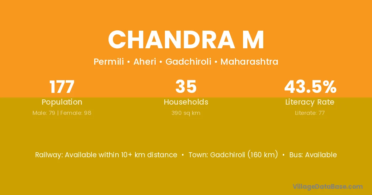 Gadchiroli (160 km) is the nearest town to Chandra M village for major economic activities and is located approximately 160 km away.