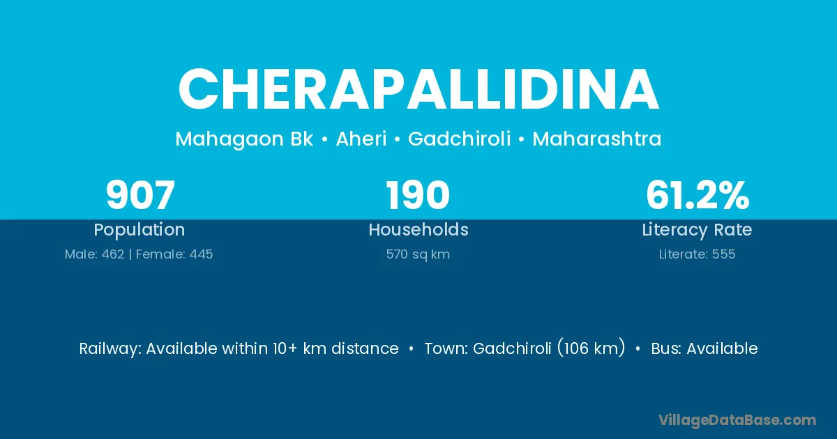 Gadchiroli (106 km) is the nearest town to Cherapallidina village for major economic activities and is located approximately 106 km away.