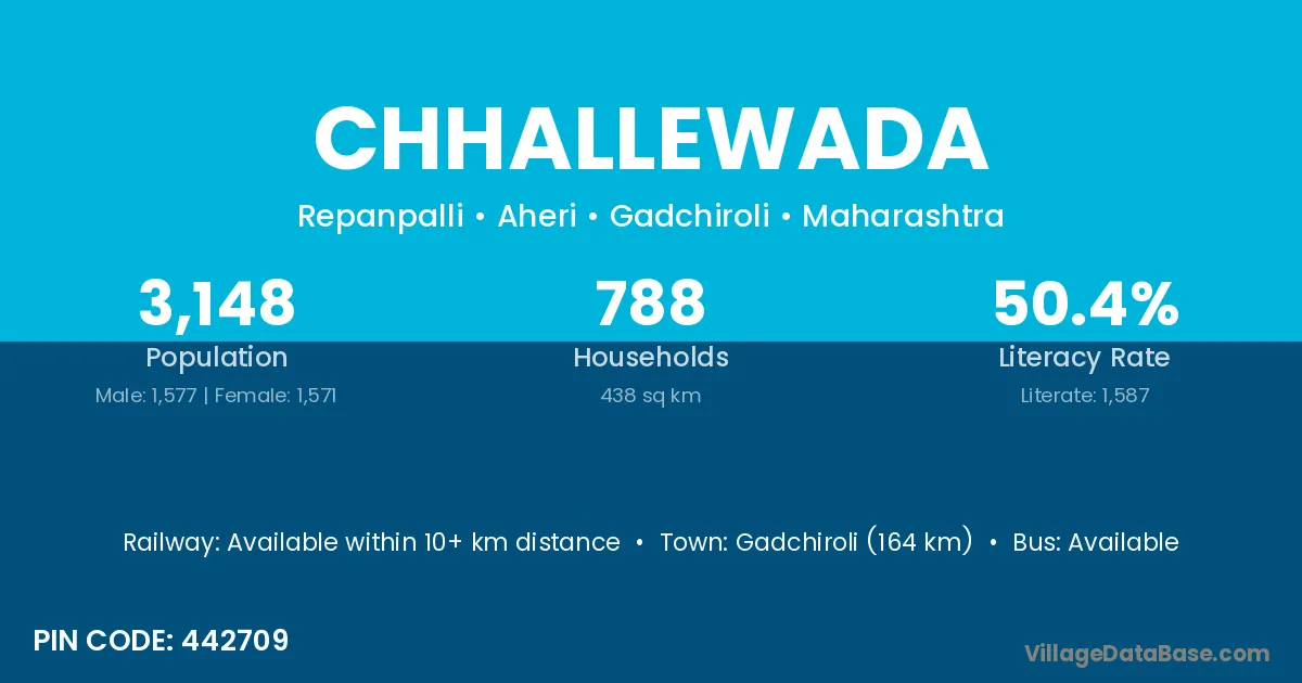 Gadchiroli (164 km) is the nearest town to Chhallewada village for major economic activities and is located approximately 164 km away.