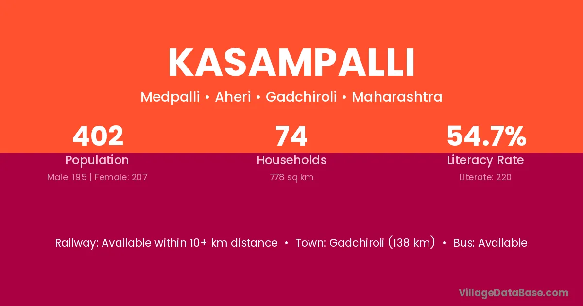 Gadchiroli (138 km) is the nearest town to Kasampalli village for major economic activities and is located approximately 138 km away.