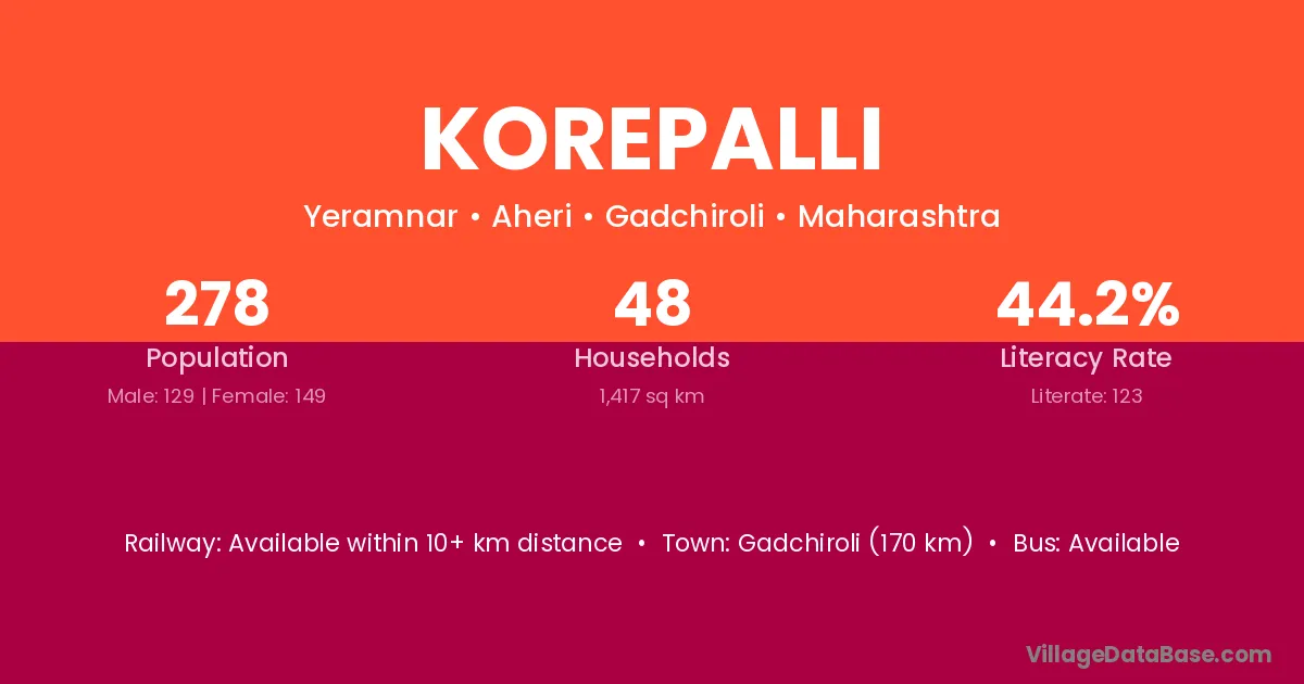 Gadchiroli (170 km) is the nearest town to Korepalli village for major economic activities and is located approximately 170 km away.