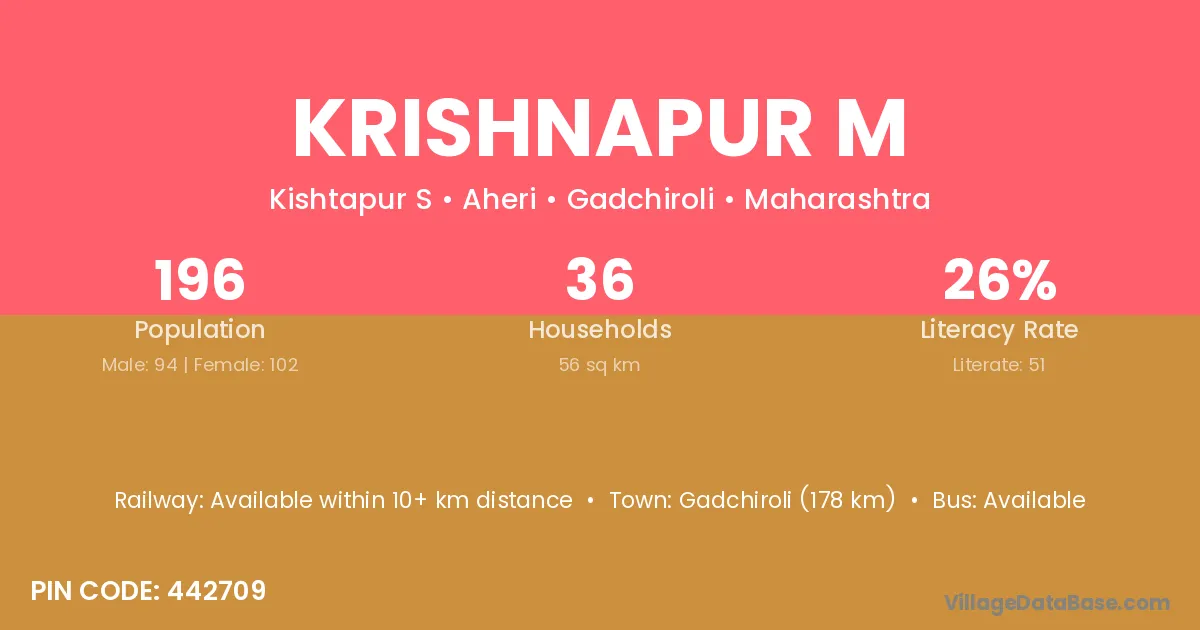 Gadchiroli (178 km) is the nearest town to Krishnapur M village for major economic activities and is located approximately 178 km away.
