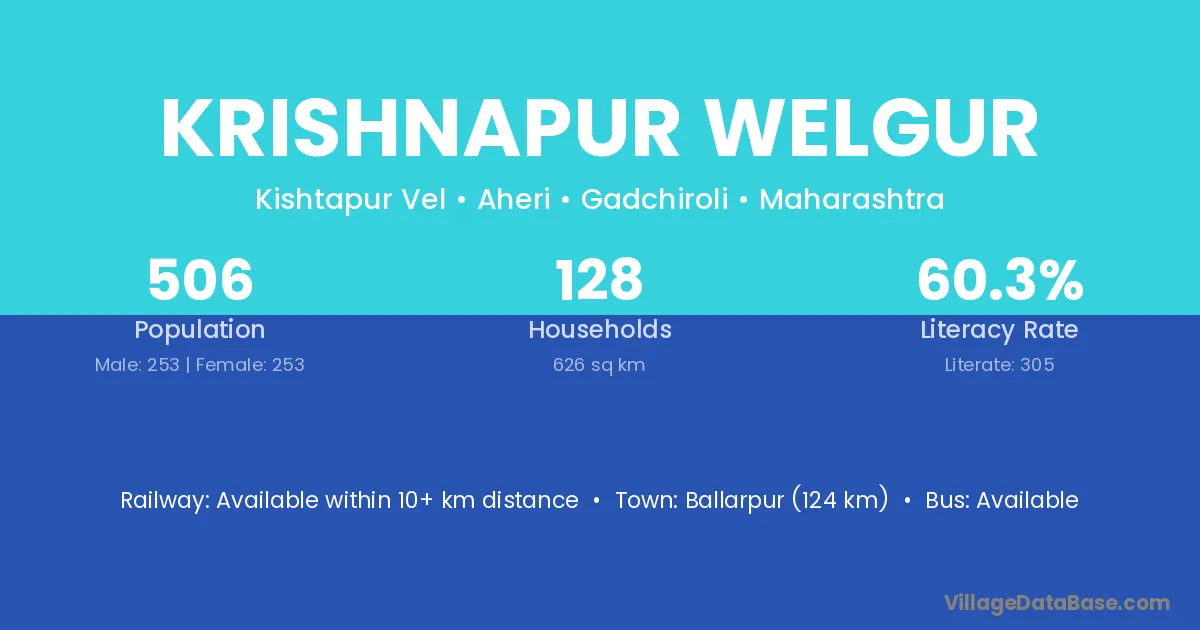 Ballarpur (124 km) is the nearest town to Krishnapur Welgur village for major economic activities and is located approximately 124 km away.