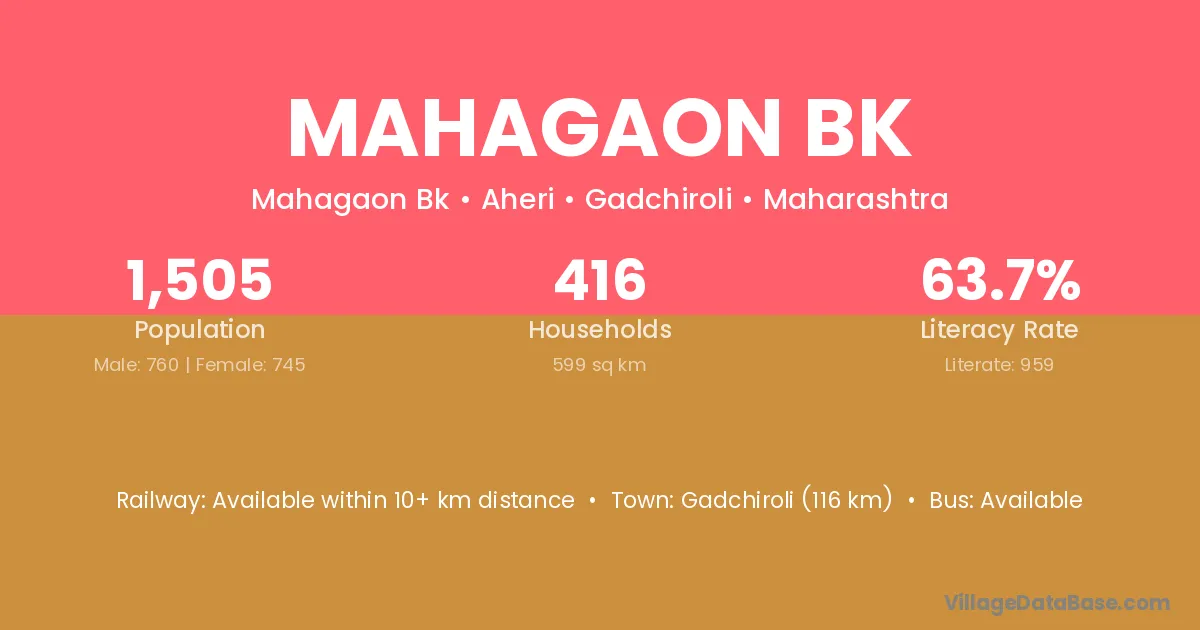 Mahagaon Bk village has a total population of 1,505 people, of which 760 are males and 745 are females.