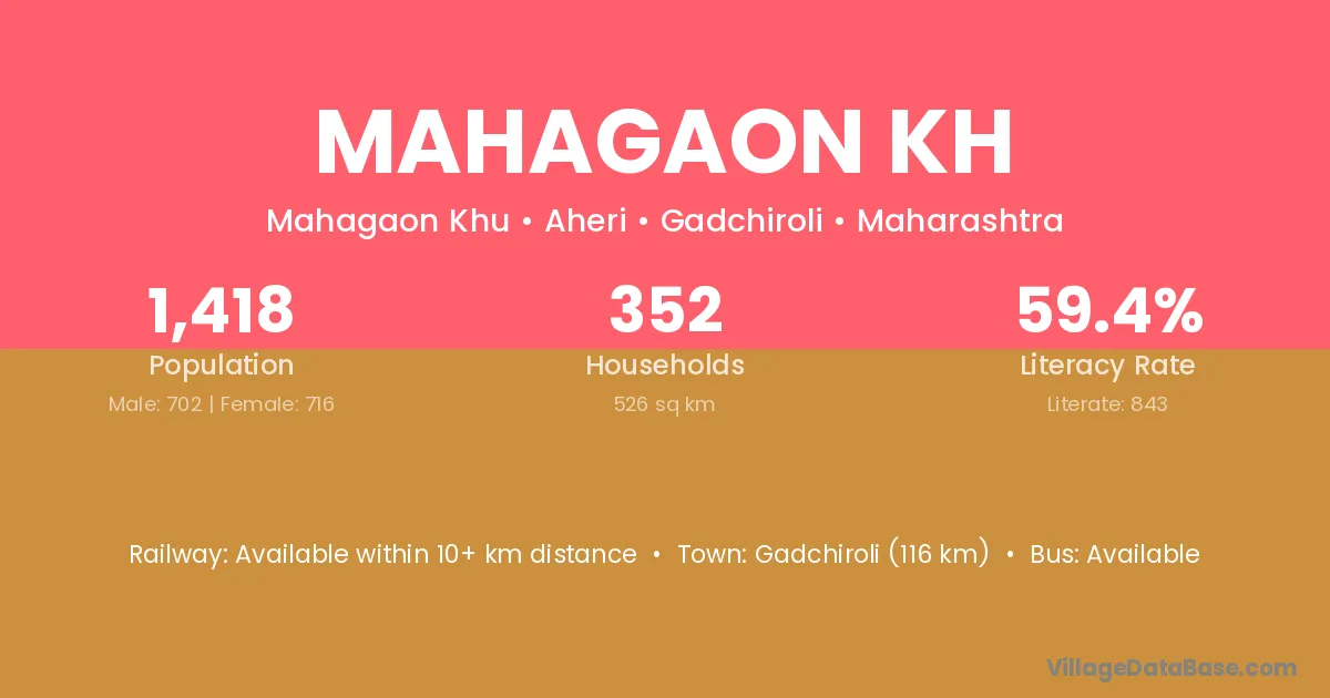 Mahagaon Kh village has a total population of 1,418 people, of which 702 are males and 716 are females.