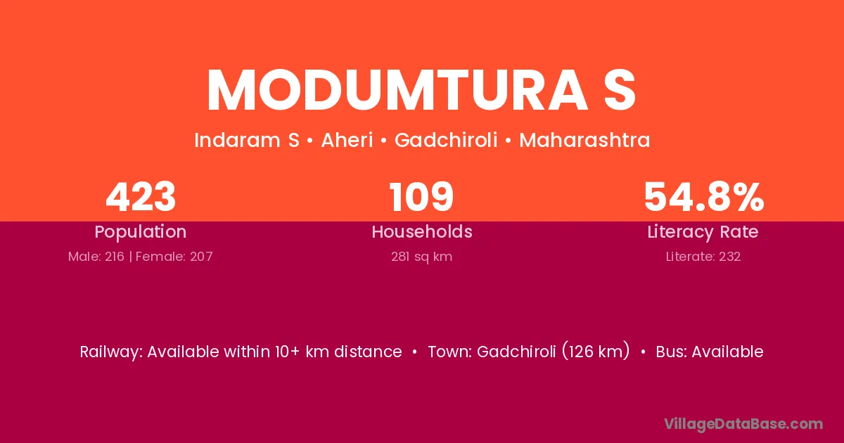 Modumtura S village has a total population of 423 people, of which 216 are males and 207 are females.