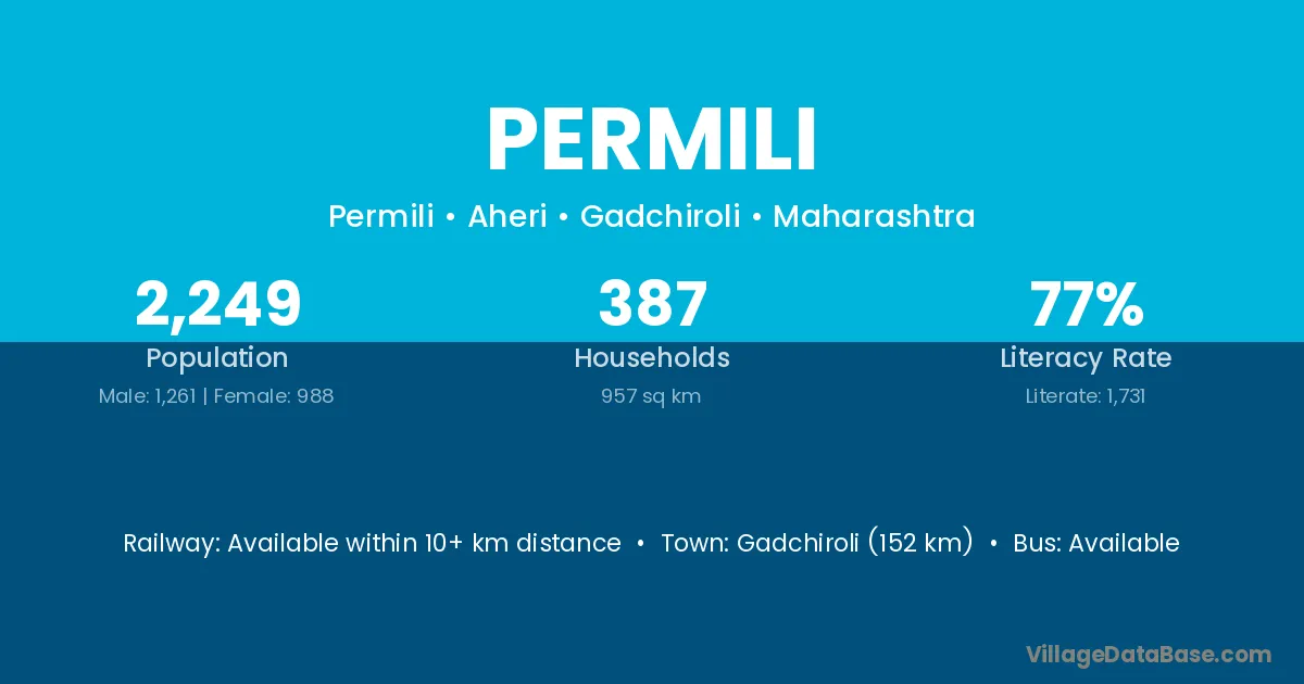 Gadchiroli (152 km) is the nearest town to Permili village for major economic activities and is located approximately 152 km away.