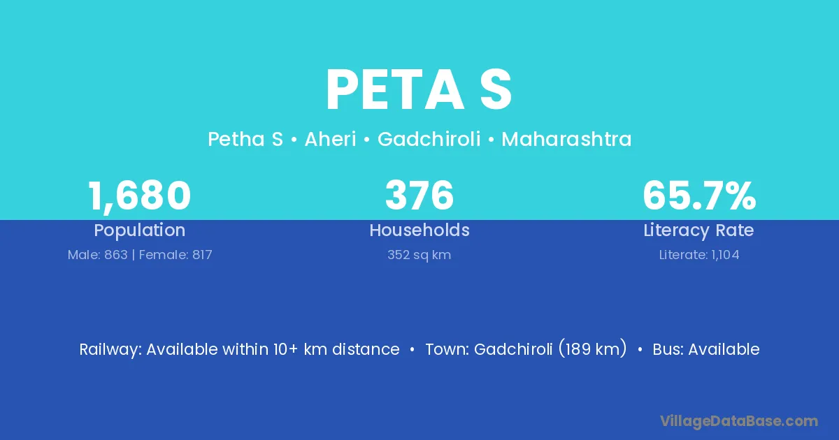 Gadchiroli (189 km) is the nearest town to Peta S village for major economic activities and is located approximately 189 km away.
