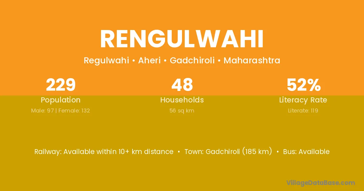 Gadchiroli (185 km) is the nearest town to Rengulwahi village for major economic activities and is located approximately 185 km away.
