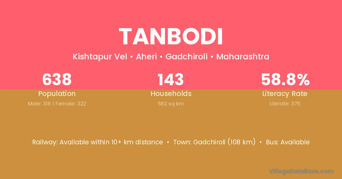 Gadchiroli (108 km) is the nearest town to Tanbodi village for major economic activities and is located approximately 108 km away.