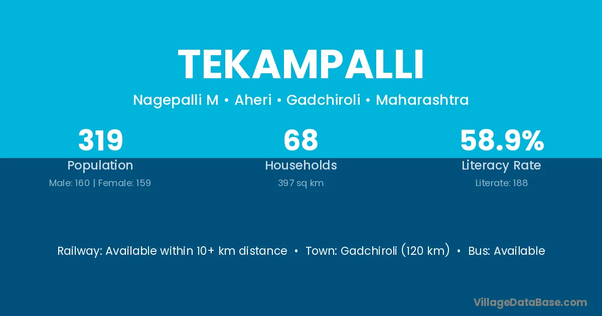 Gadchiroli (120 km) is the nearest town to Tekampalli village for major economic activities and is located approximately 120 km away.