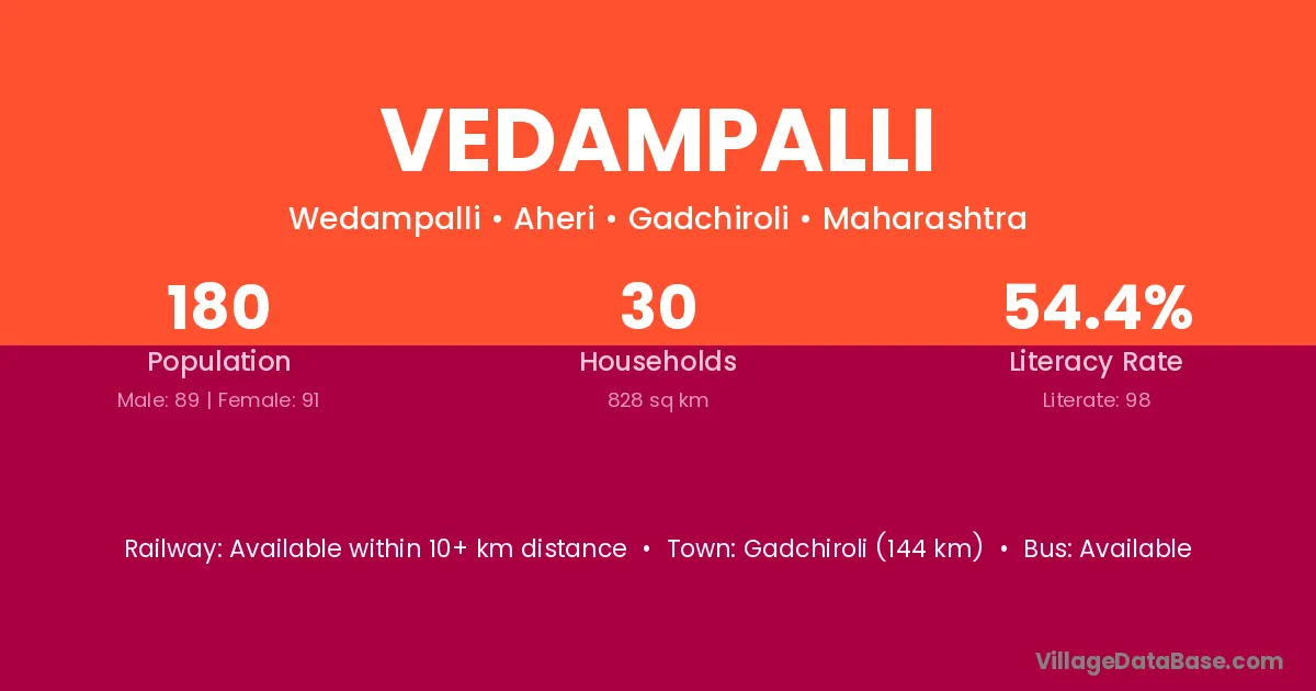 Gadchiroli (144 km) is the nearest town to Vedampalli village for major economic activities and is located approximately 144 km away.