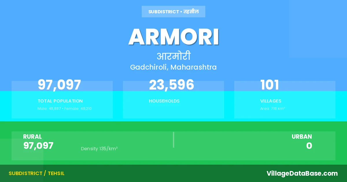 According to the 2011 census The total area of Armori Tehsil is 718 km², with a population of 97097 people. The population density is 135 inhabitants per square kilometre, and there are approximately 23596 houses in the sub district.