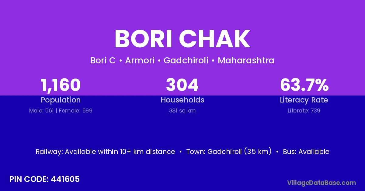 Gadchiroli (35 km) is the nearest town to Bori Chak village for major economic activities and is located approximately 35 km away.