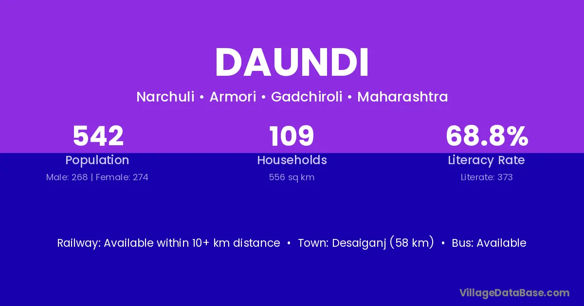 Desaiganj (58 km) is the nearest town to Daundi village for major economic activities and is located approximately 58 km away.