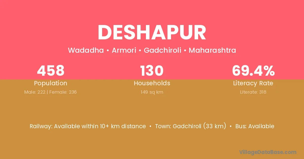 Gadchiroli (33 km) is the nearest town to Deshapur village for major economic activities and is located approximately 33 km away.