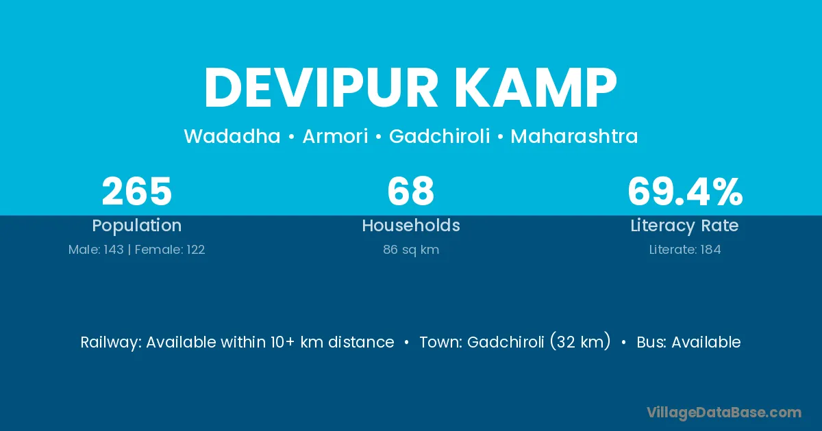 Gadchiroli (32 km) is the nearest town to Devipur Kamp village for major economic activities and is located approximately 32 km away.
