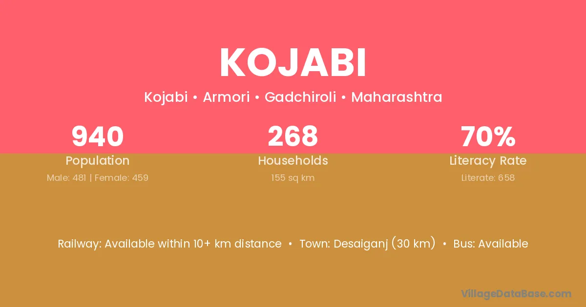 Desaiganj (30 km) is the nearest town to Kojabi village for major economic activities and is located approximately 30 km away.