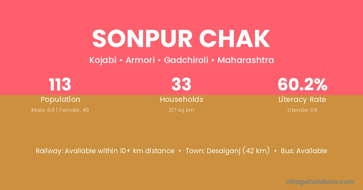 Desaiganj (42 km) is the nearest town to Sonpur Chak village for major economic activities and is located approximately 42 km away.