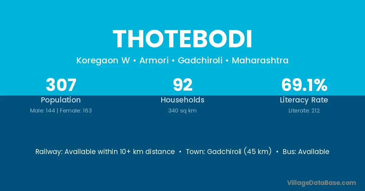 Gadchiroli (45 km) is the nearest town to Thotebodi village for major economic activities and is located approximately 45 km away.