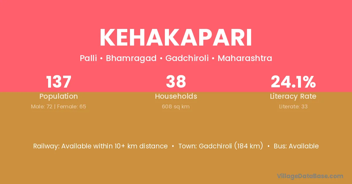 Gadchiroli (184 km) is the nearest town to Kehakapari village for major economic activities and is located approximately 184 km away.