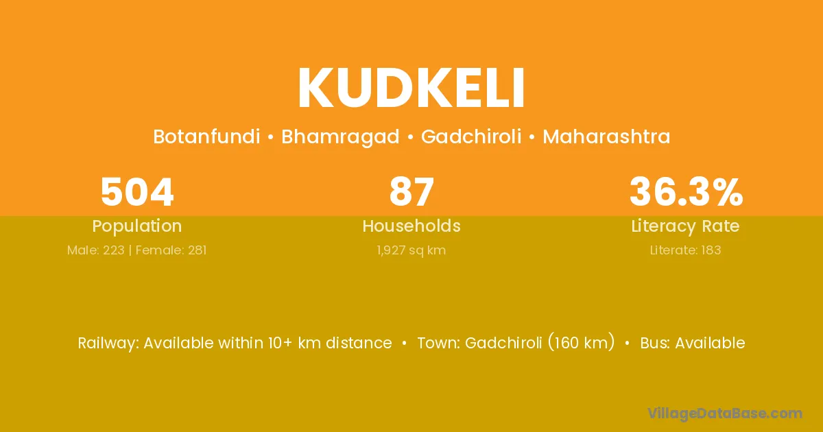 Gadchiroli (160 km) is the nearest town to Kudkeli village for major economic activities and is located approximately 160 km away.