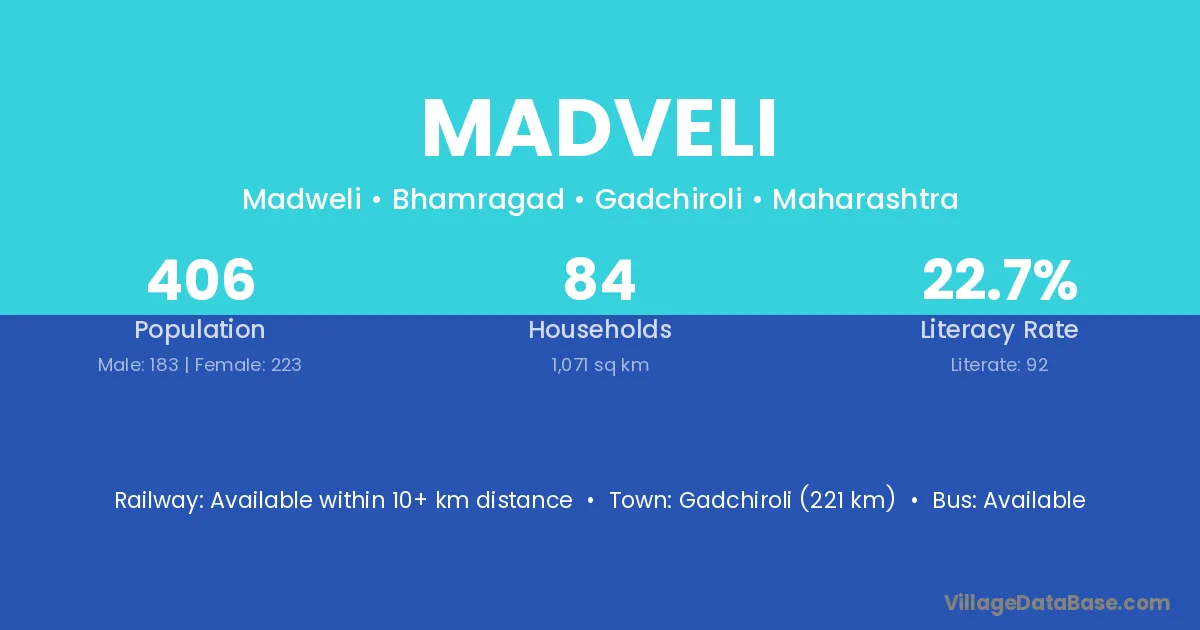 Gadchiroli (221 km) is the nearest town to Madveli village for major economic activities and is located approximately 221 km away.