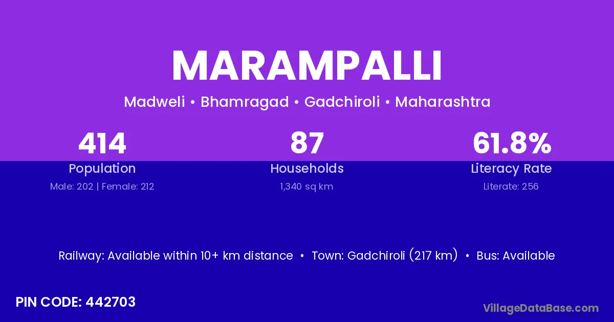Gadchiroli (217 km) is the nearest town to Marampalli village for major economic activities and is located approximately 217 km away.