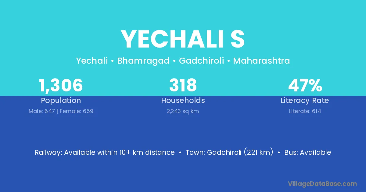 Gadchiroli (221 km) is the nearest town to Yechali S village for major economic activities and is located approximately 221 km away.