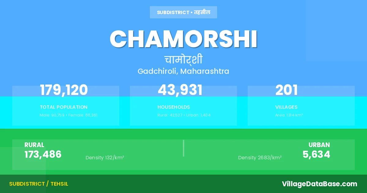 According to the 2011 census The total area of Chamorshi Tehsil is 1314 km², with a population of 179120 people. The population density is 136 inhabitants per square kilometre, and there are approximately 43931 houses in the sub district.