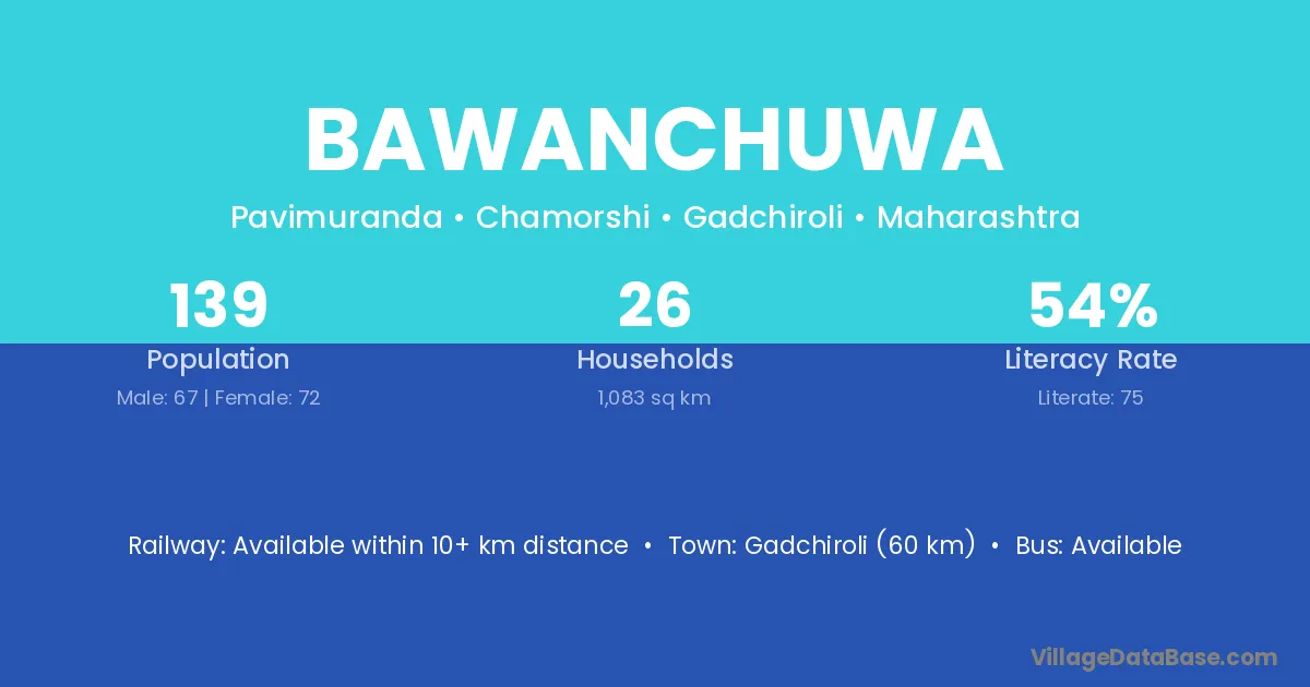 Gadchiroli (60 km) is the nearest town to Bawanchuwa village for major economic activities and is located approximately 60 km away.