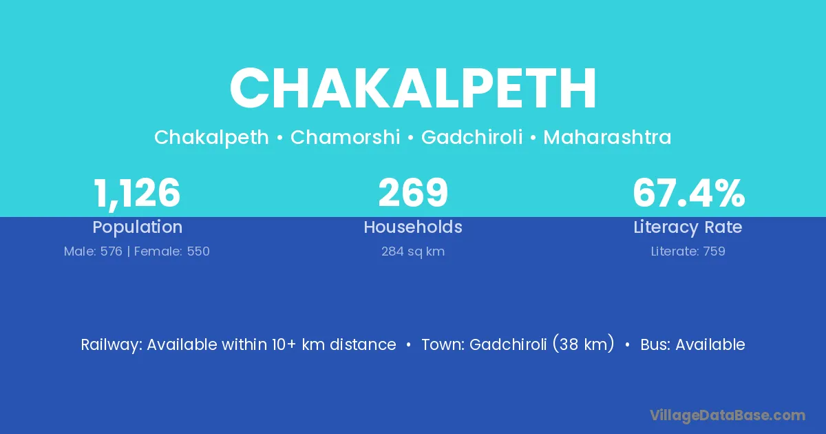 Gadchiroli (38 km) is the nearest town to Chakalpeth village for major economic activities and is located approximately 38 km away.