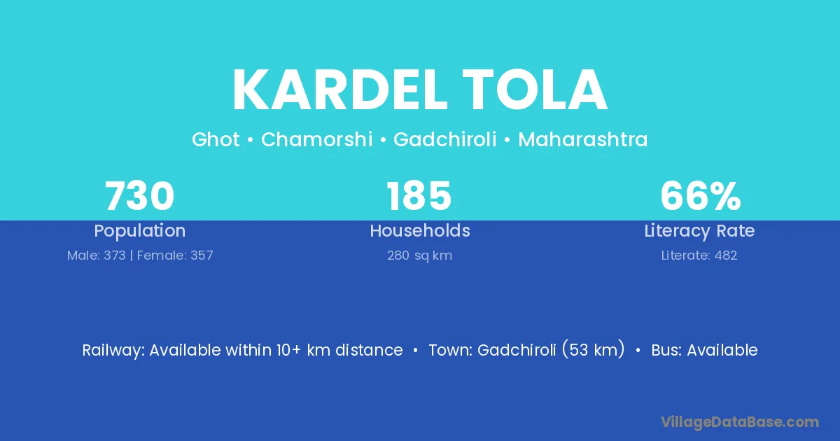 Gadchiroli (53 km) is the nearest town to Kardel Tola village for major economic activities and is located approximately 53 km away.
