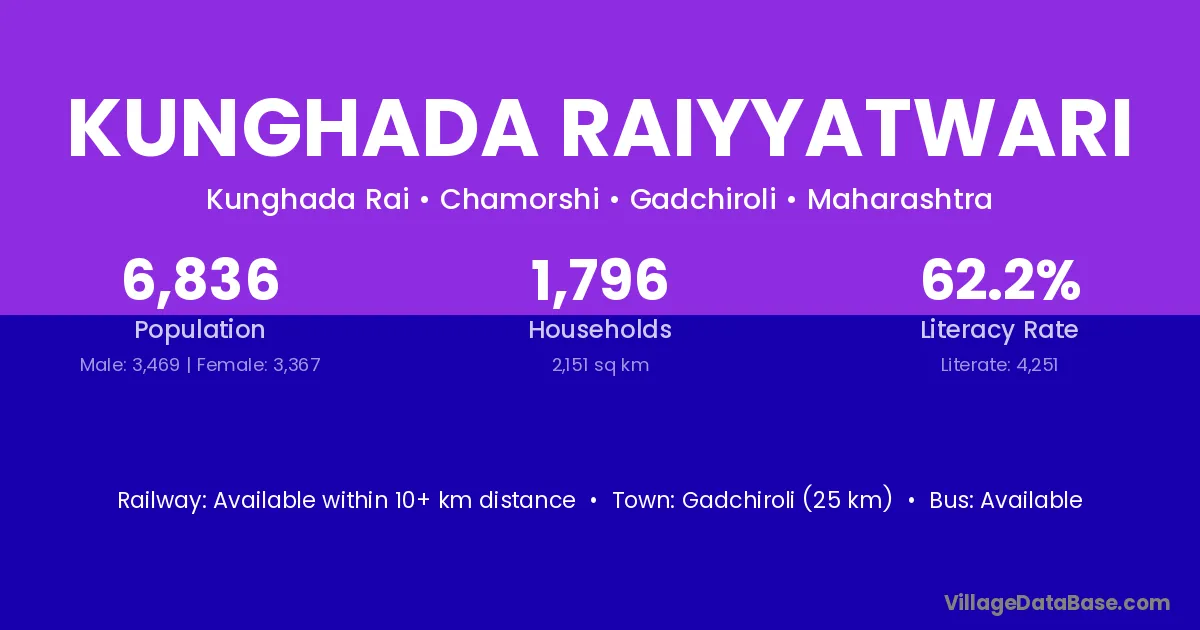 Gadchiroli (25 km) is the nearest town to Kunghada Raiyyatwari village for major economic activities and is located approximately 25 km away.