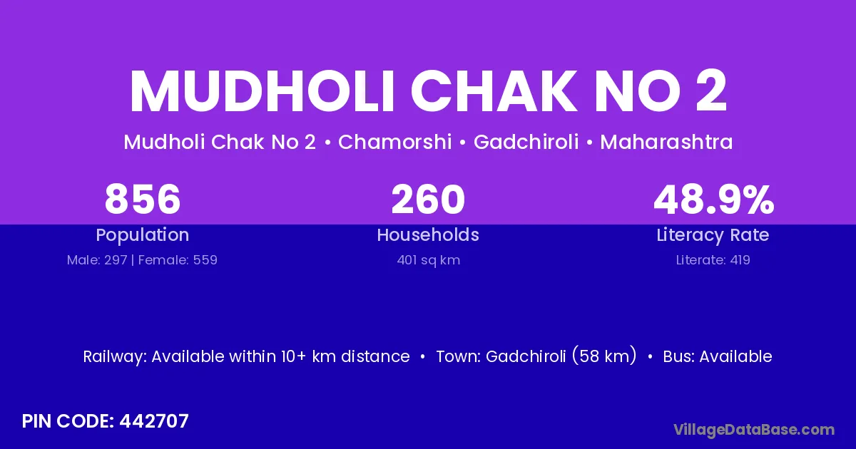 Gadchiroli (58 km) is the nearest town to Mudholi Chak No 2 village for major economic activities and is located approximately 58 km away.