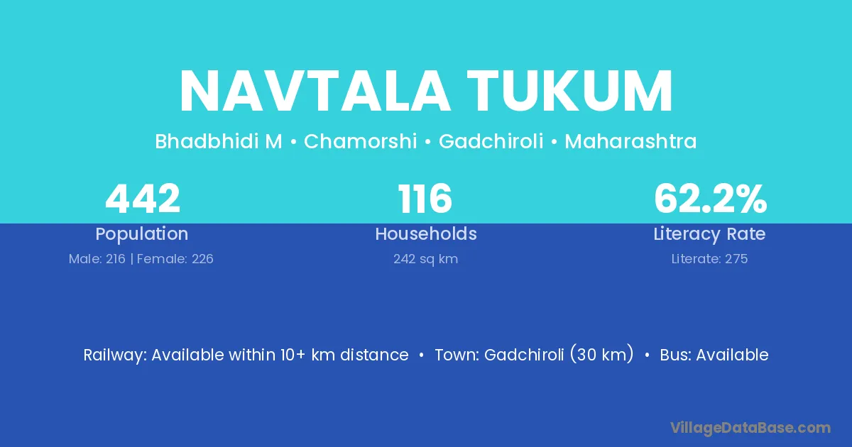 Gadchiroli (30 km) is the nearest town to Navtala Tukum village for major economic activities and is located approximately 30 km away.