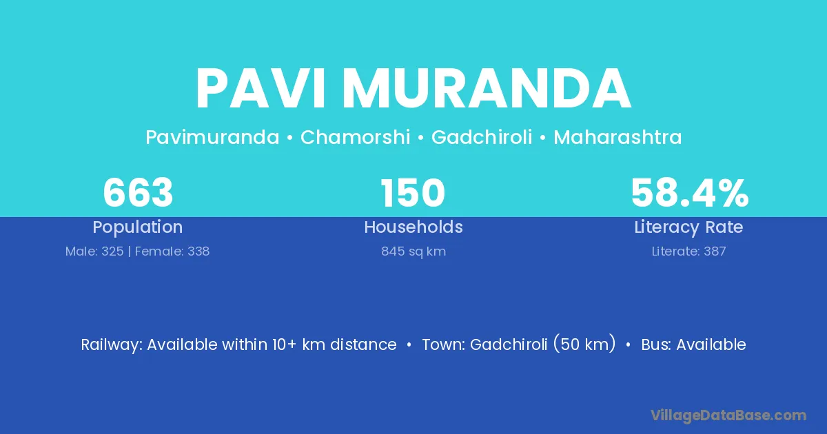 Gadchiroli (50 km) is the nearest town to Pavi Muranda village for major economic activities and is located approximately 50 km away.