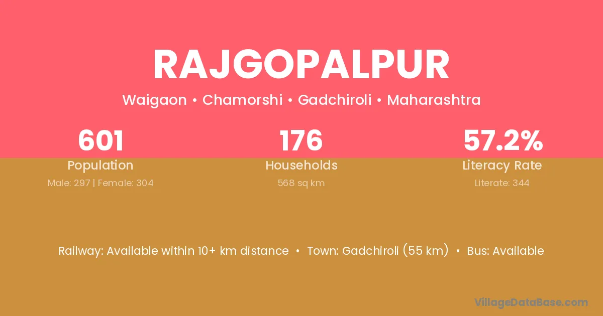Gadchiroli (55 km) is the nearest town to Rajgopalpur village for major economic activities and is located approximately 55 km away.