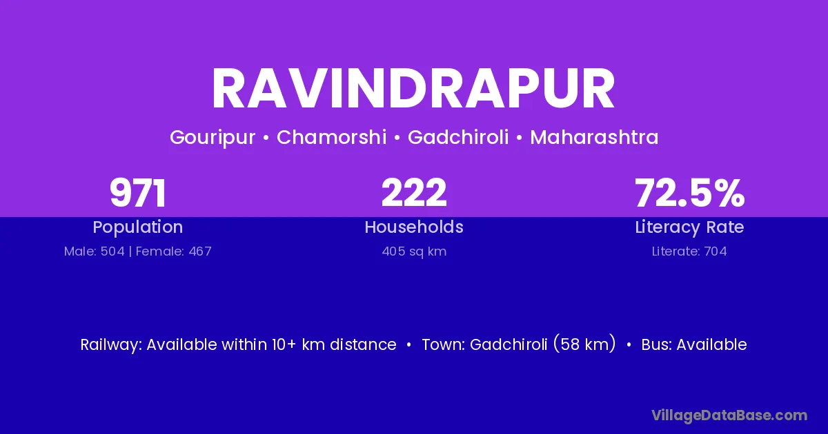 Gadchiroli (58 km) is the nearest town to Ravindrapur village for major economic activities and is located approximately 58 km away.