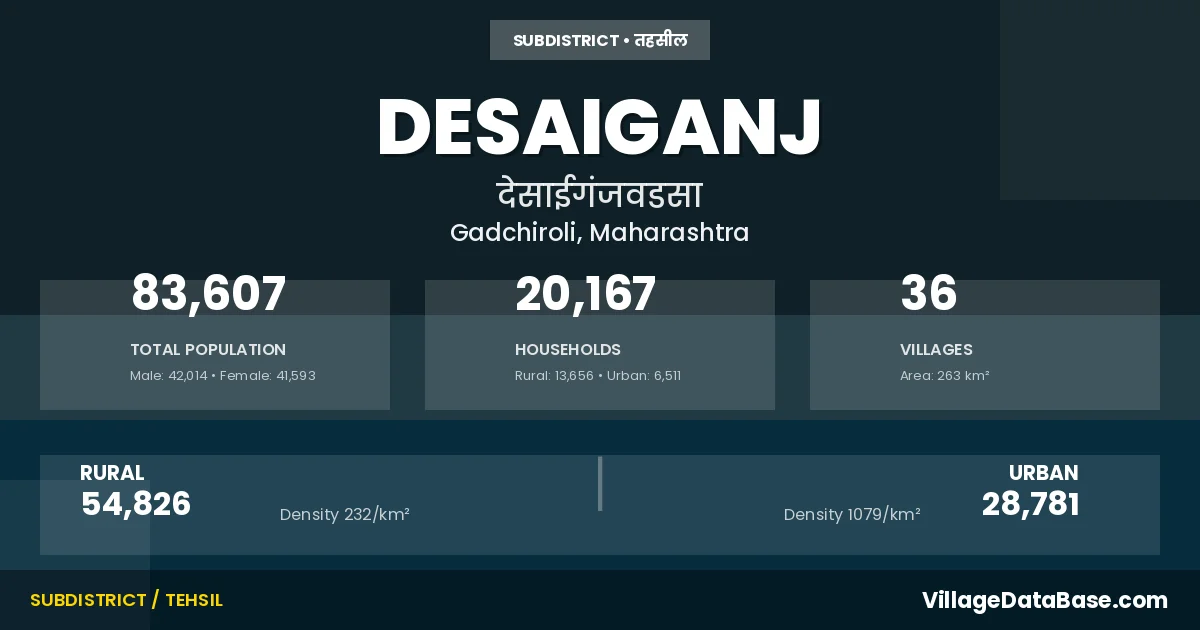 According to the 2011 census The total area of Desaiganj Tehsil is 263 km², with a population of 83607 people. The population density is 318 inhabitants per square kilometre, and there are approximately 20167 houses in the sub district.