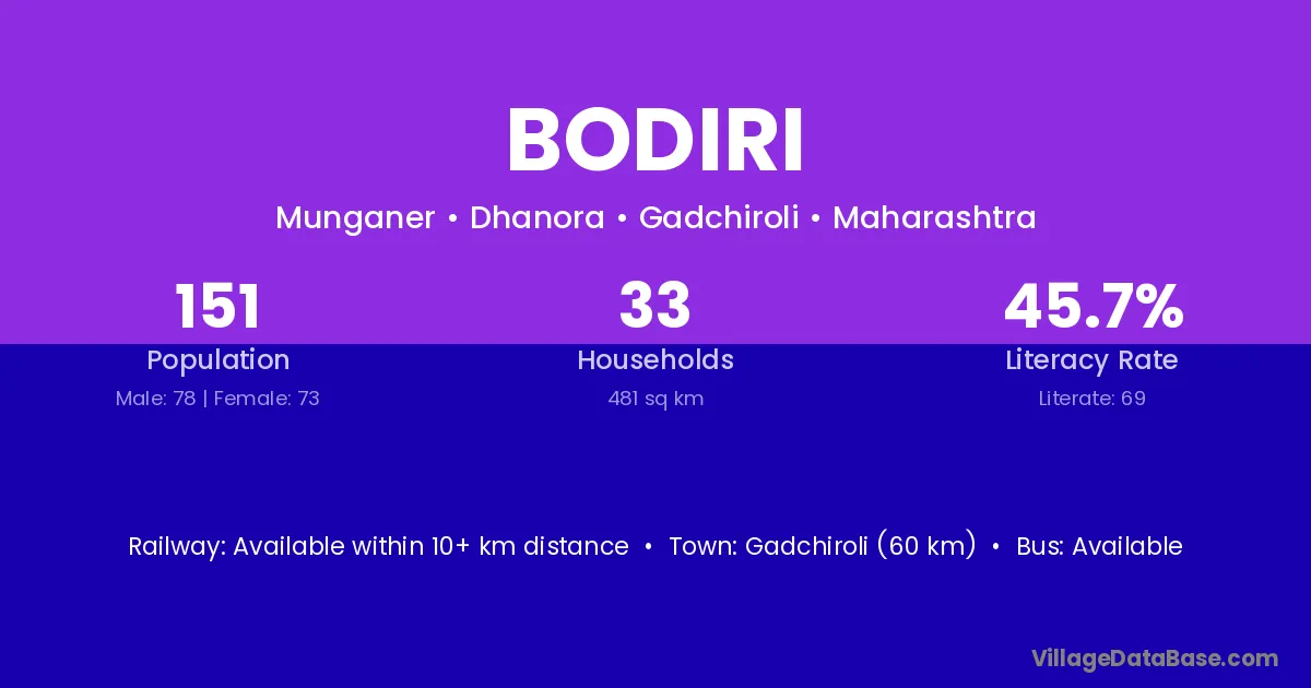 Gadchiroli (60 km) is the nearest town to Bodiri village for major economic activities and is located approximately 60 km away.