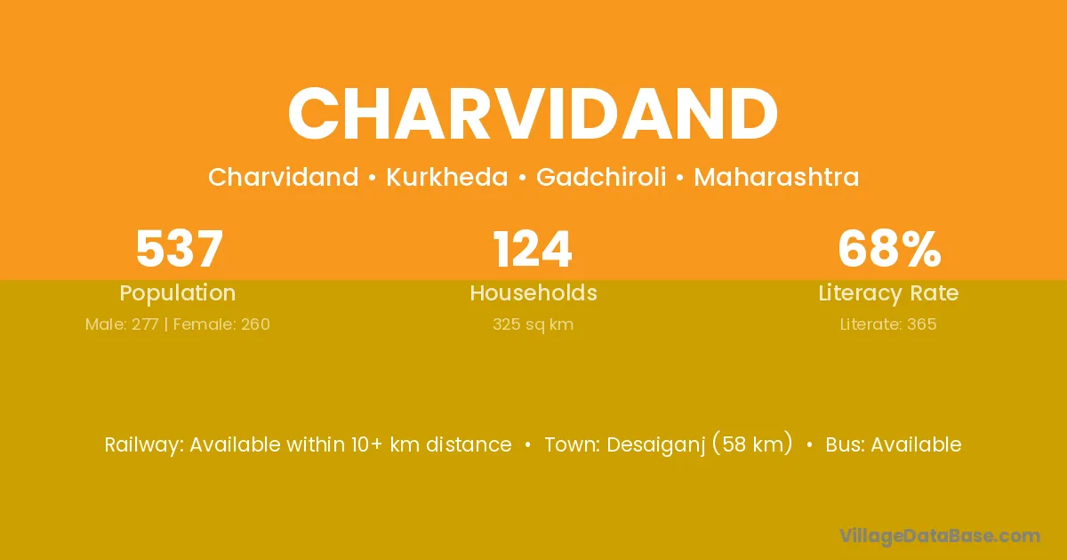 Gadchiroli (57 km) is the nearest town to Charvidand village for major economic activities and is located approximately 57 km away.