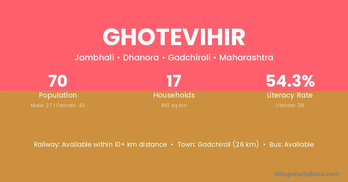 Gadchiroli (26 km) is the nearest town to Ghotevihir village for major economic activities and is located approximately 26 km away.