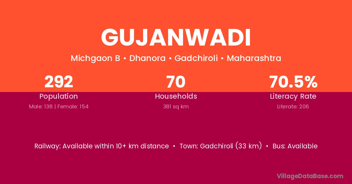 Gadchiroli (33 km) is the nearest town to Gujanwadi village for major economic activities and is located approximately 33 km away.